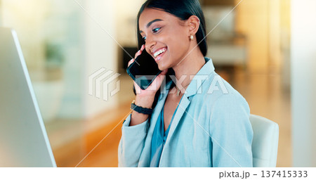 Businesswoman talking on phone, reading research on computer and networking with clients or negotiating deals. Confident woman multitasking, connecting and sharing ideas with customers on technology