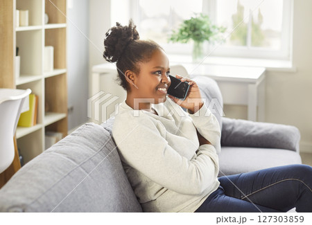 Young african american woman talking on phone at home, happy girl holding cellphone making call