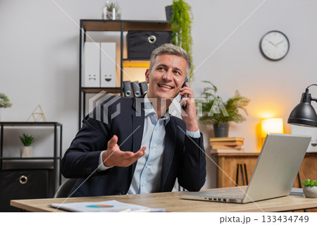 Phone call, businessman and happy for communication, contact and network in office. A senior entrepreneur person on a grey wall with a cellphone for conversation and thinking about corporate idea