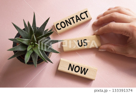 Contact us now symbol. Wooden blocks with words Contact us now. Beautiful pink background with succulent plant. Businessman hand. Business and Contact us now concept. Copy space.