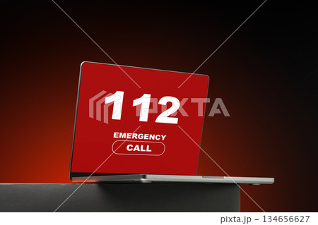 Emergency call screen displaying 112 on a laptop in a dimly lit setting