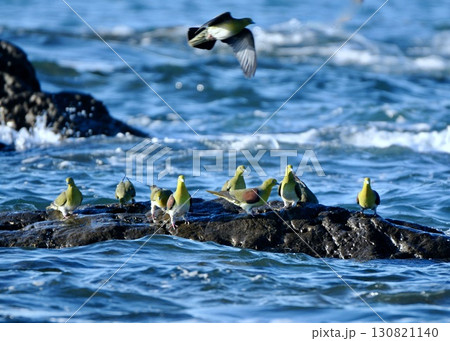 荒れる海に海水を飲みに来たアオバトの群れ。