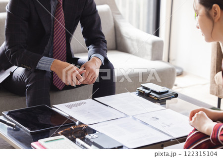 Cropped shot financial advisor pointing at reports planning investment project with client