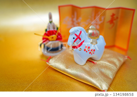 午の置物と金の座布団