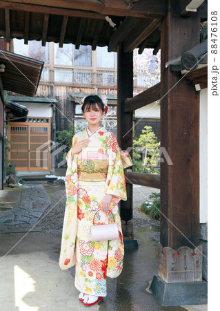 成人前撮り和のロケーションで振袖ロケーション撮影、振り袖姿の日本人女性