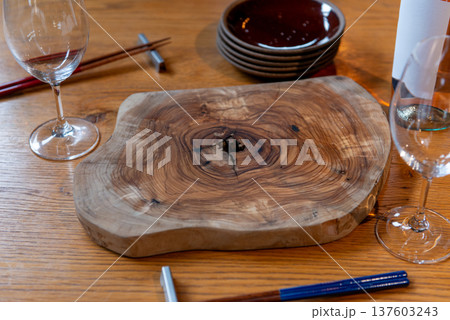 天然木の年輪が美しいカッティングボードとテーブルセット
