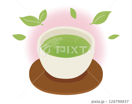 ピンクのほんわかした雰囲気の緑茶のイラスト