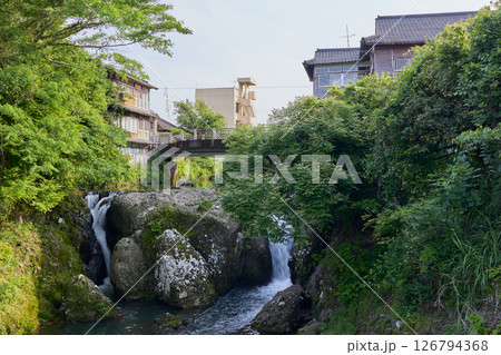 湯の滝公園から見る市比野川と湯の滝と市比野温泉街