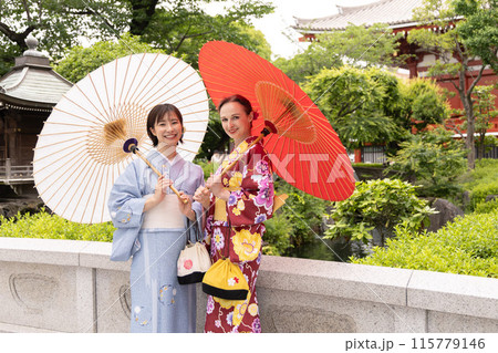 日本庭園で和傘を差す着物姿の外国人女性と日本人女性