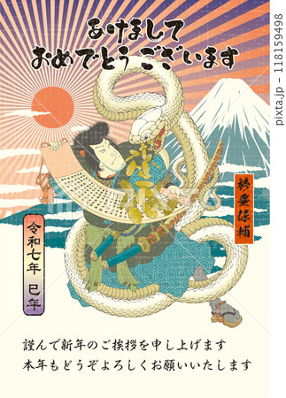 2025年賀状テンプレート「袴垂保輔」ハッピーニューイヤー 英語添え書き付