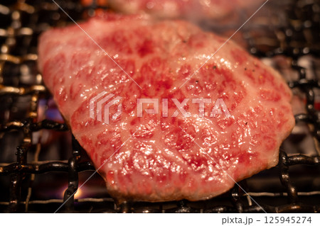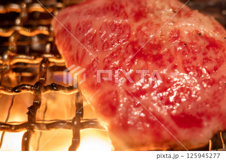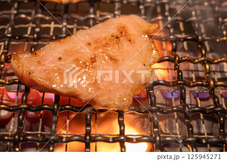 網の上で焼かれているお肉 炭火あみ焼きのお肉 あみ焼きで焼き上がったお肉