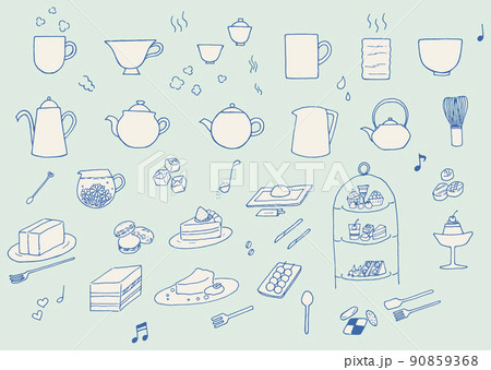 ティータイム お茶セット スイーツ お菓子の手書きイラストのセット