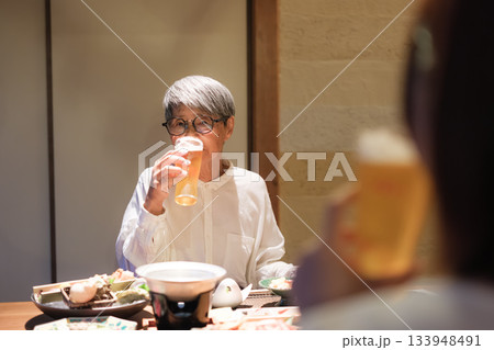 旅館の夕食で親子がビールを楽しむ穏やかなひととき