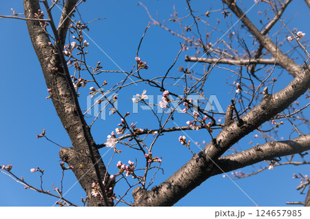 青空に映える咲き始めの桜