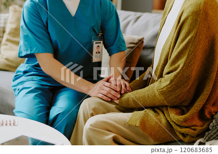 Medical professional holding hands with an elderly person during a consultation, offering comfort and support in caregiving setting