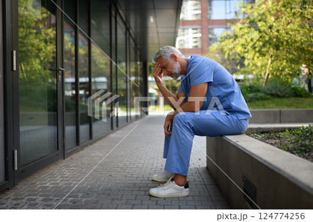 Frustrated and burnt-out doctor sitting outside the hospital, feeling down.