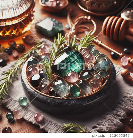 Tourmaline gemstones, October birthstone, in various cuts and shades, artistically arranged in a bowl with decorative elements