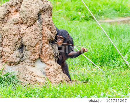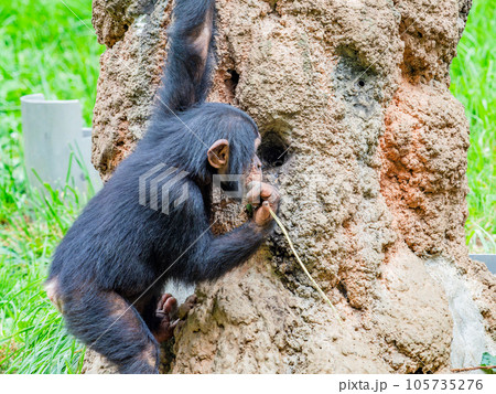 枝を使って懸命に蜜をなめるチンパンジーの子ども