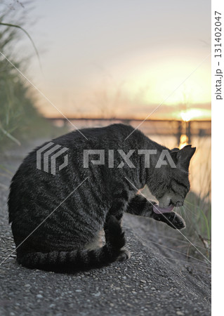 堤防で遊ぶとら猫
