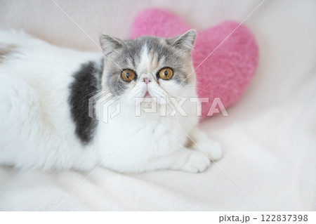 白バックとピンクのハートとエキゾチックショートヘアーのバストアップ
