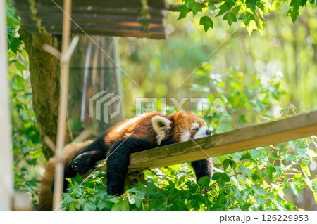 気持ちよさそうに眠るシンリンオオカミのいる動物園の風景