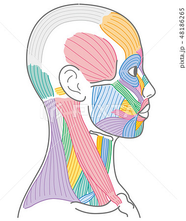 斜めの角度から見た顔の筋肉(髪型なし/カラー付き名称あり)