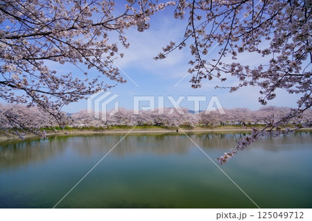 奈良の弥生遺跡 唐古・鍵遺跡の唐古池に咲く満開の桜並木
