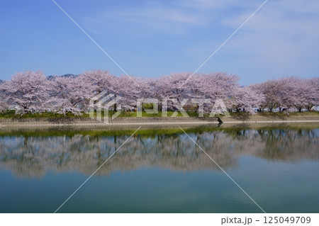 奈良の弥生遺跡 唐古・鍵遺跡の唐古池に咲く満開の桜並木と花筏