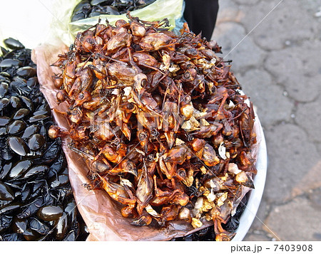 食用の虫(左)と雀の素揚げ(右)(プノンペン/カンボジア)