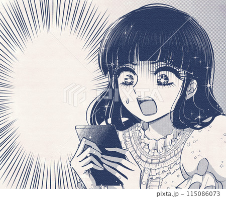 スマホを見て唖然とするレトロ漫画風のお姫様のイラスト