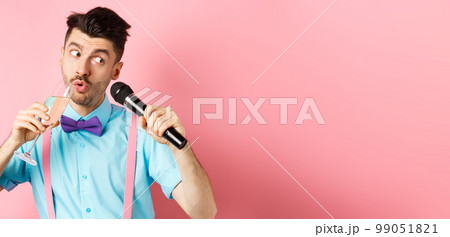 Party and festive events concept. Funny guy singing karaoke, performing song with microphone and drinking champagne from glass, standing on pink background