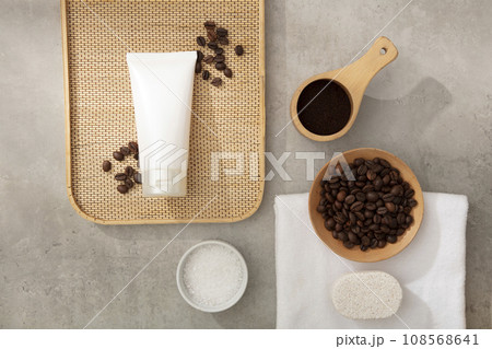 Top view of gray marble tray container an amber cosmetic jar with organic ingredient - coffee beans, coffee powder, bath salt and ear of wheat on white tiles background. Mockup for advertising