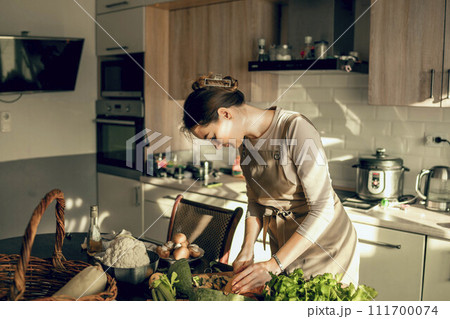 young woman peels the green pumpkin. Cooking a vegan lunch in the kitchen equipped with appliances