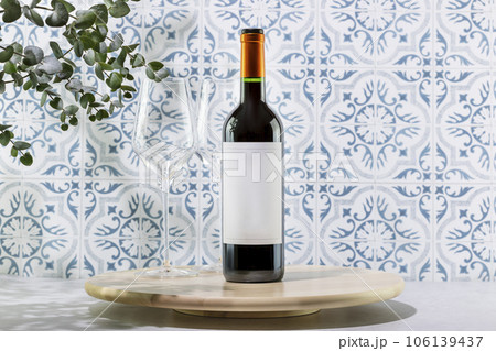 Mockup of bottle of red wine. Bottle with red wine on wooden podium opposite tile wall with eucalyptus leaves and shadows. Presentation, advertising or promotion sale natural wine. Front view