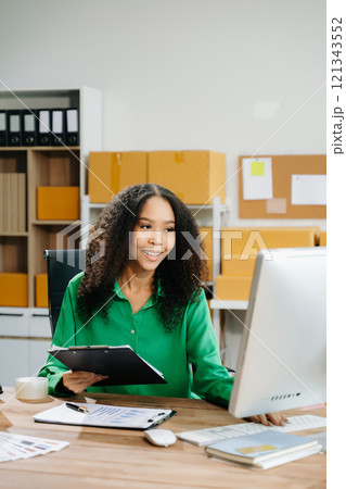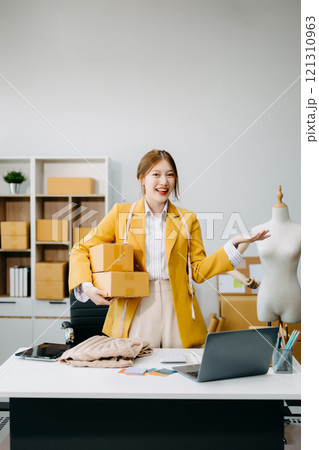 Portrait of Starting small businesses SME owners, two Asian woman check online orders Selling products working with boxs freelance work at home office, sme business online small medium enterprise