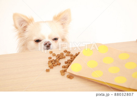 机の上のドッグフードを盗み食いするクリーム色のロングコートチワワ
