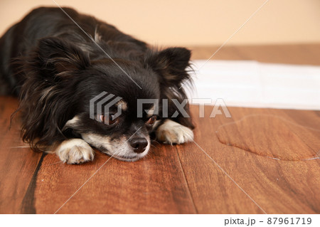 トイレシーツにおしっこできずに失敗をしてしまったロングコートチワワ