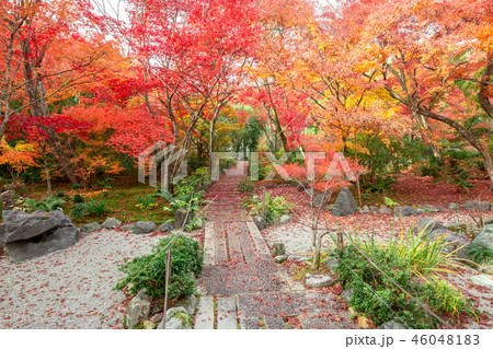 宝筐院の秋、本堂から見た参道のカラフルな庭、オレンジ色の紅葉