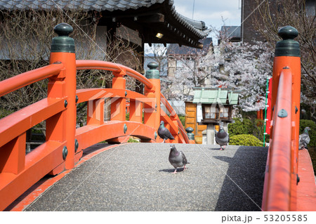 神泉苑、善女竜王社から架かる「法成橋」を渡る鳩たち