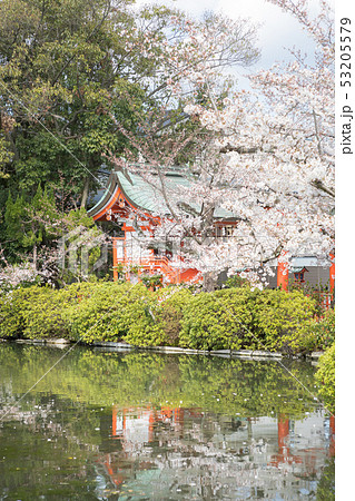 神泉苑、法成就池と満開の桜、矢剱大明神社殿