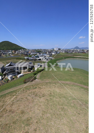 善通寺市の有岡古墳群の王墓山古墳の墳丘上から、善通寺の五重塔や讃岐富士を遠望する