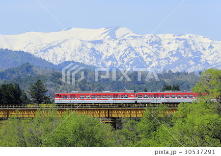 新緑の磐越西線と残雪の飯豊連峰
