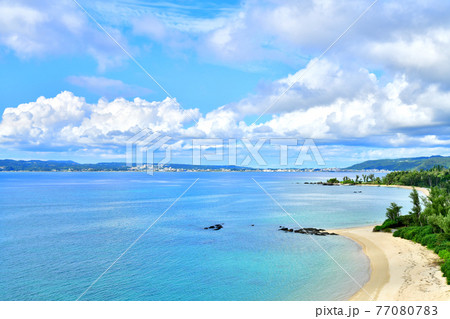 沖縄県、喜瀬ビーチと部瀬名岬方面の風景