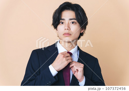 鏡の前で身だしなみを整えるスーツ姿の男性