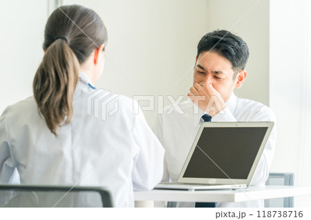 病院で女医に問診を受ける男性ビジネスマン(人間ドック・診断・診察)
