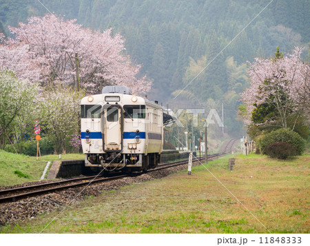 鹿児島県霧島市の嘉例川駅から発車する電車 満開の桜と列車