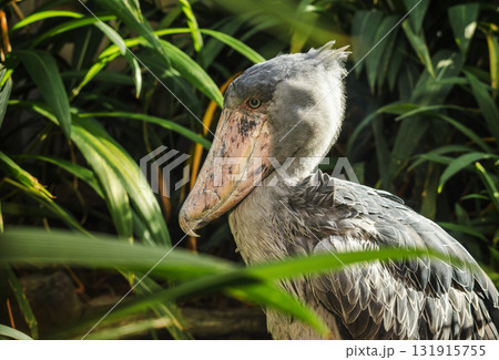 Shoebill stork with large beak standing among green tropical plants in sunlight