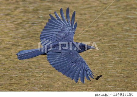 翼を広げて川の上を飛ぶハシボソガラス