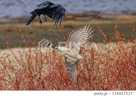 ハシボソガラスから逃げるハイタカ幼鳥