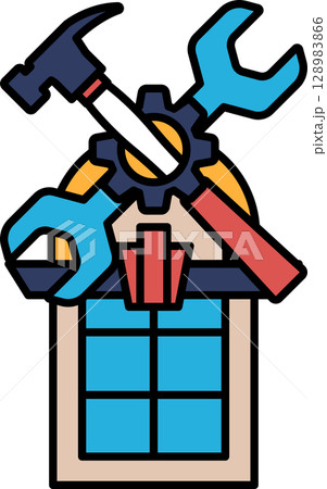 A blue and red toolbox with a hammer and wrench on top